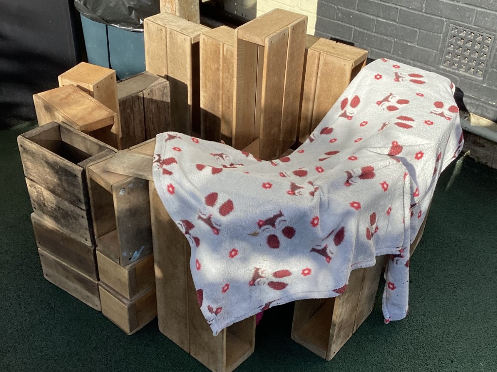 Children have been building houses using big wooden blocks and incorporating them into their role play, developing construction skills, creativity, and social learning through collaborative play.