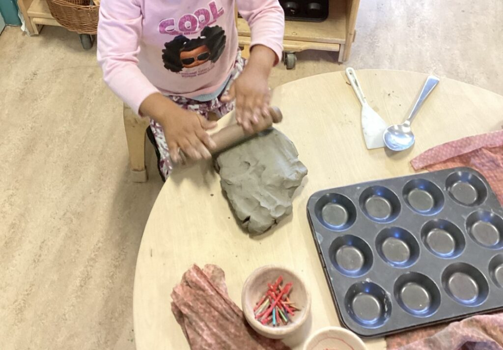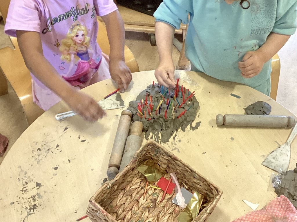 The children have been making birthday cakes out of clay, using fine motor skills to manipulate different clay tools. This creative activity supports both their artistic expression and physical development.