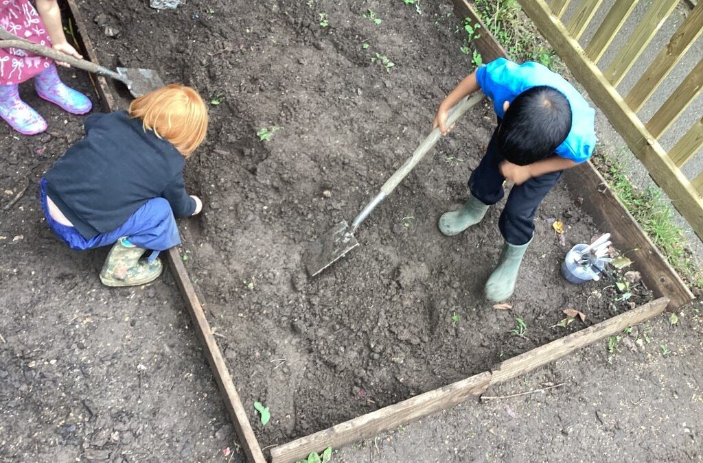 The children have been working hard in the allotment this week, using real tools to dig and transport soil whilst exploring what happens when they pour water and experience what the water does to the soil.