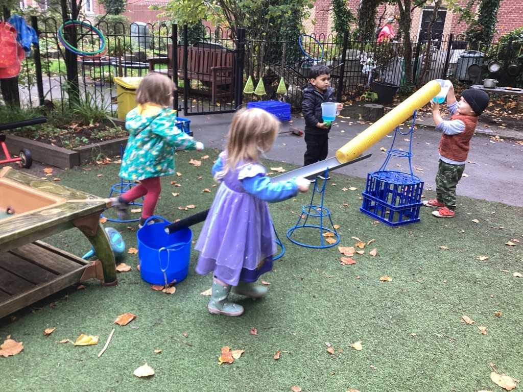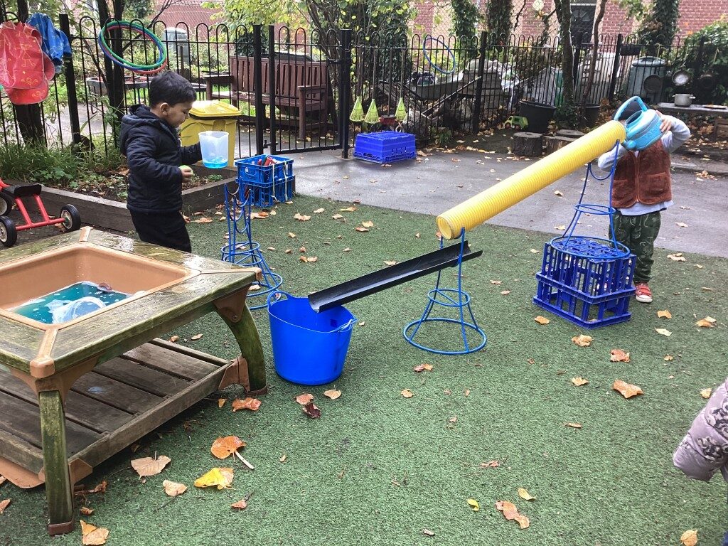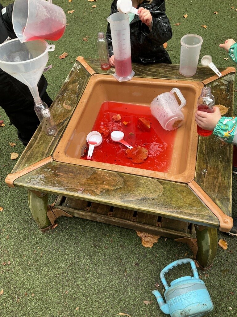 The children have been enjoying lots of creative water play in the garden with funnels and tunnels, exploring how water flows and moves whilst experimenting with cause and effect through pouring and watching water travel through different pathways. This hands-on investigation supports scientific thinking and problem-solving skills.
