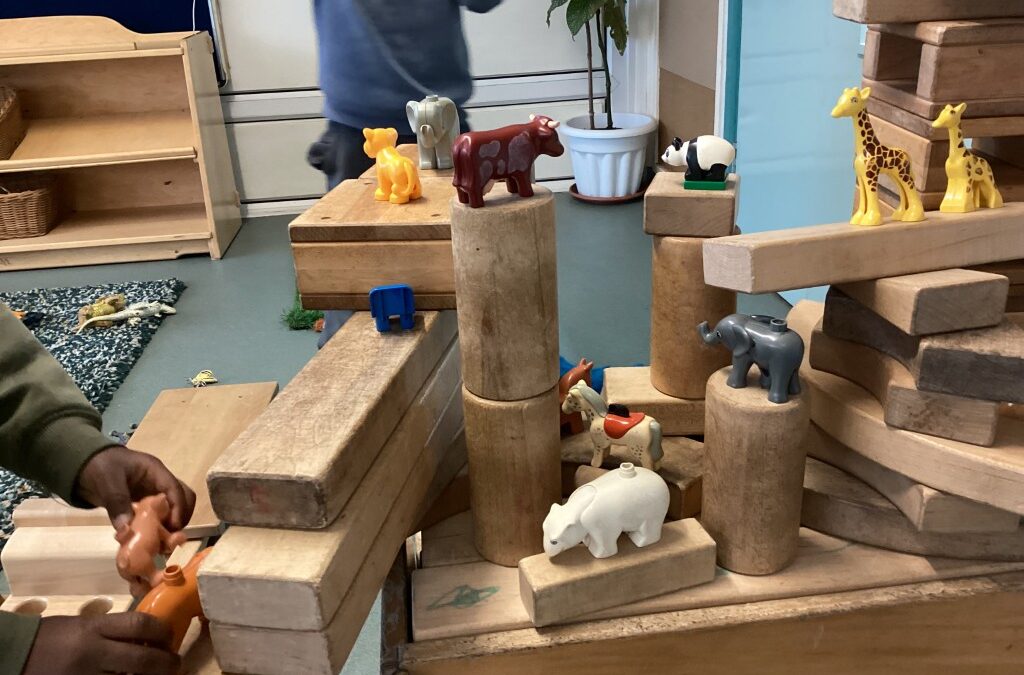 This week, we have been focusing on our block play, both indoors and outdoors, discovering the many possibilities that construction offers. The children have created houses for animals, developing their imaginative play and storytelling whilst thinking about structure and space. They have used blocks to climb and explore, building physical confidence and gross motor skills through active construction play, and to sit on, testing their creations and understanding practical uses for their buildings. This open-ended block play supports mathematical thinking, problem-solving, and spatial awareness whilst encouraging creativity and collaborative building.