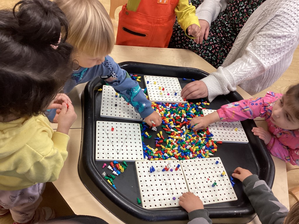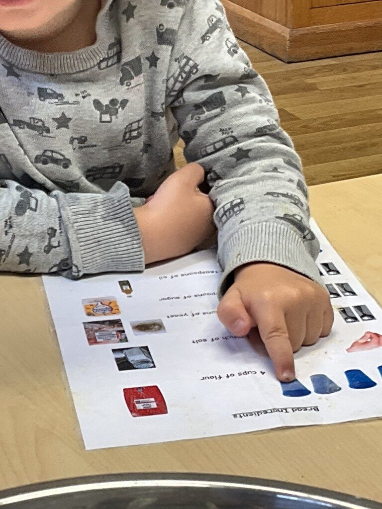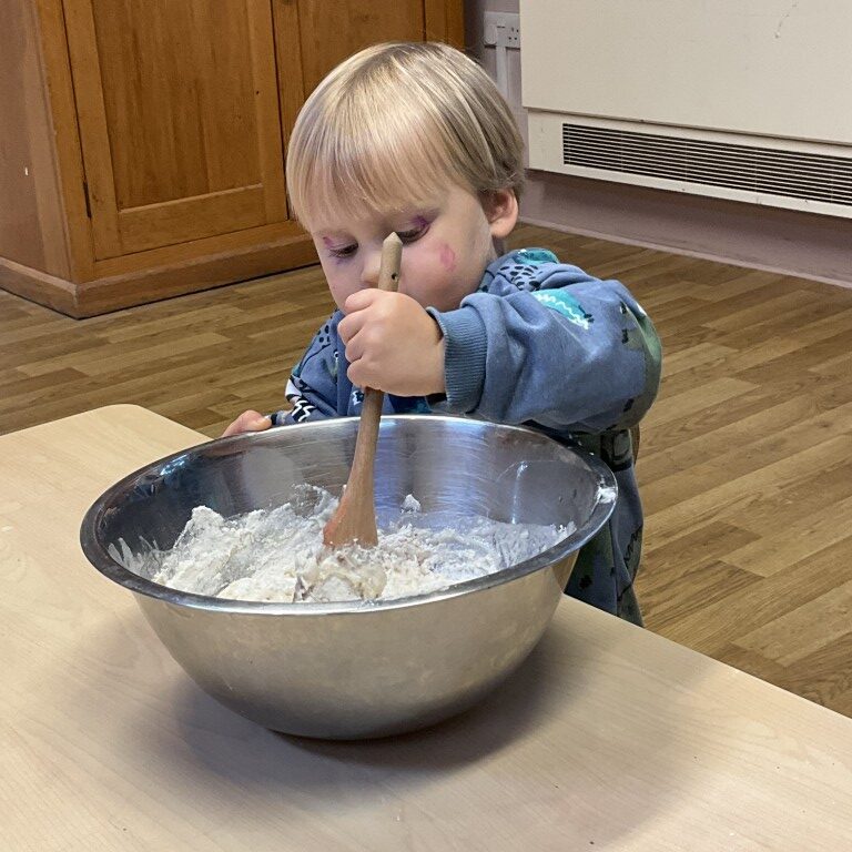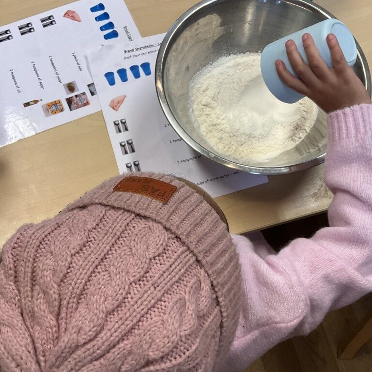 We have been making patterns with the peg boards, exploring mathematical concepts through arranging colours and shapes in sequences. The children have also been baking bread this week to share with our friends at snack time, using a visual recipe and following step-by-step instructions whilst learning about measuring, mixing, and the transformation of ingredients through baking.