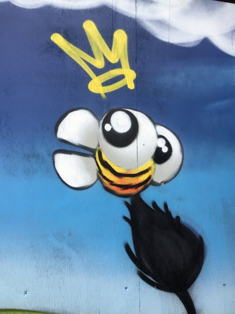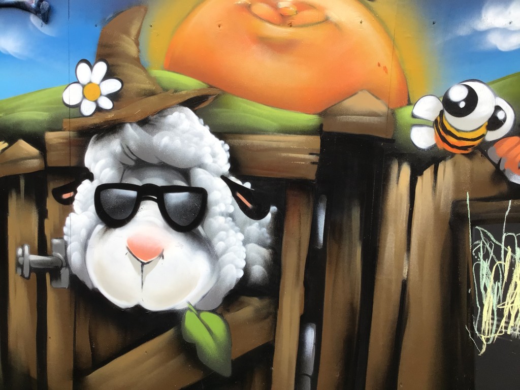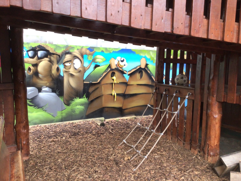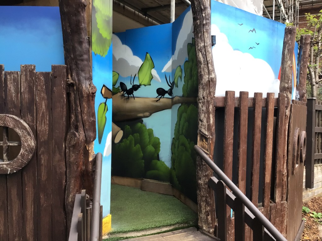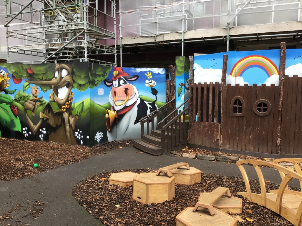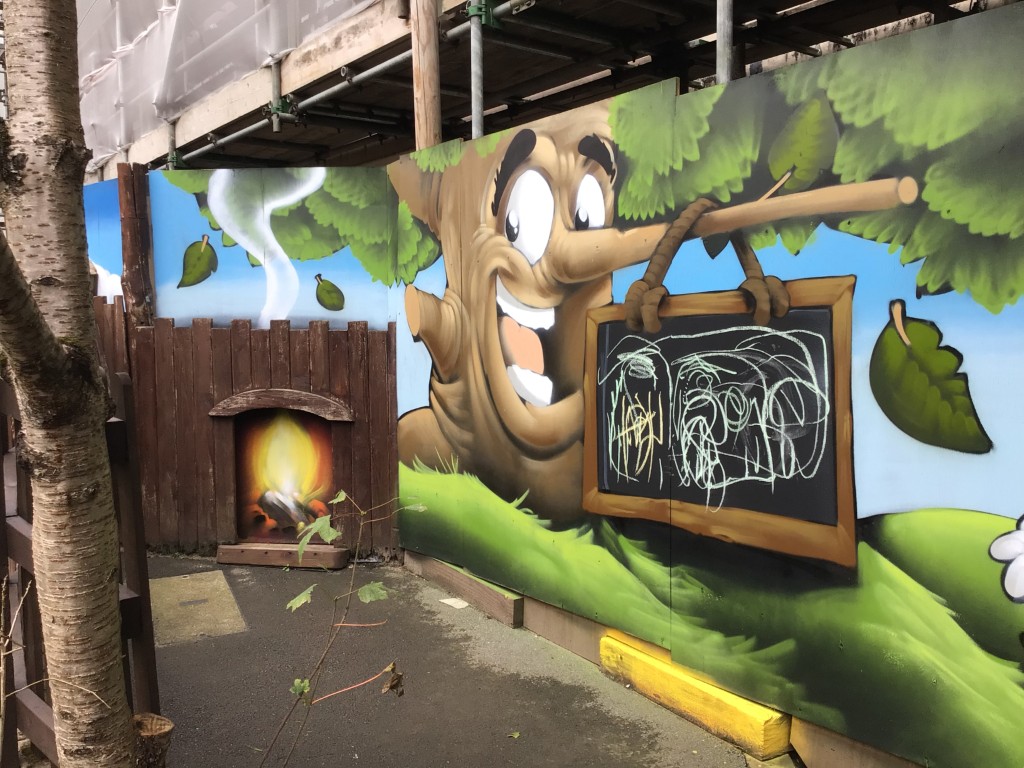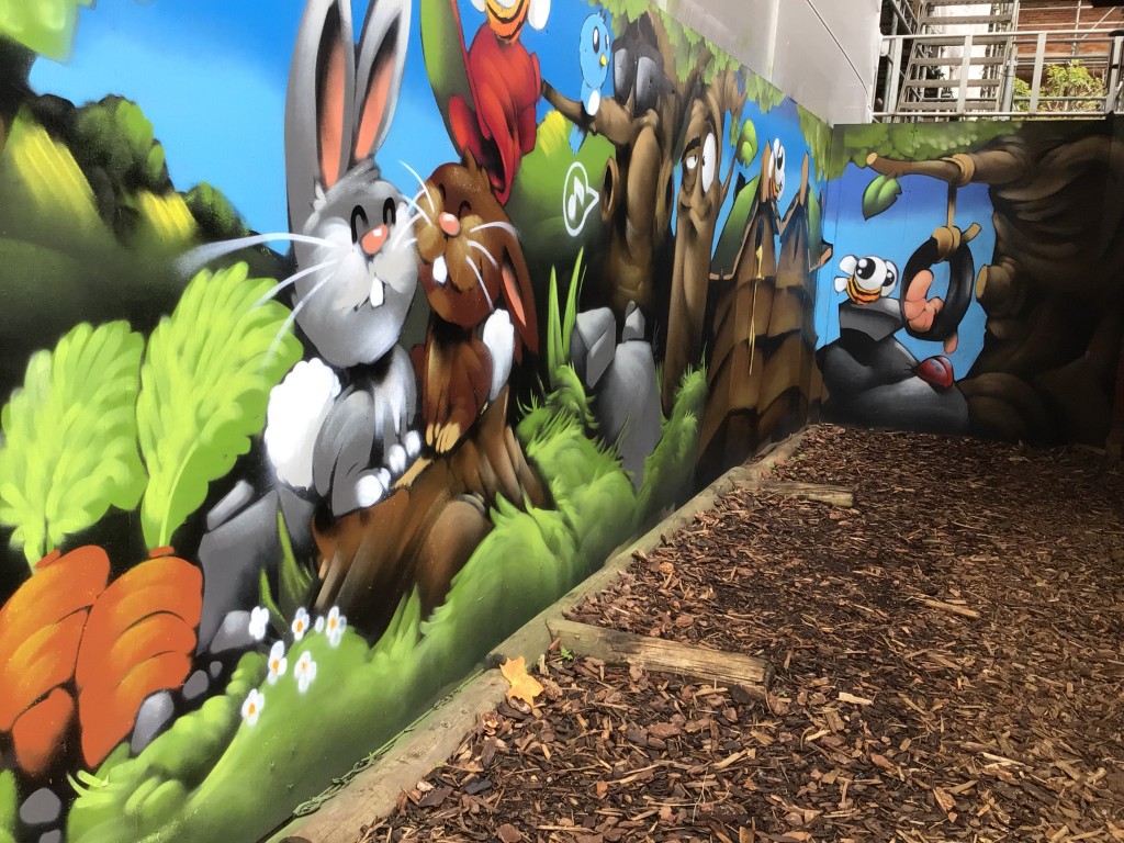 He captured what was important to us at Rosemary – the children’s love of the outdoors, animals we had at our 100th birthday party, their wonder of insects, and even left spaces for them to create their own artwork. He also captured our beautiful sunflowers! This wonderful artwork celebrates our nursery community and provides a colourful backdrop for outdoor play and learning, whilst giving children the opportunity to contribute their own creative marks to this collaborative piece.