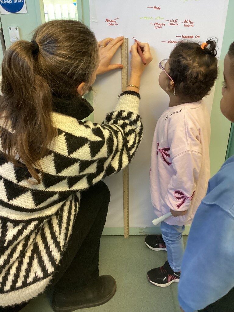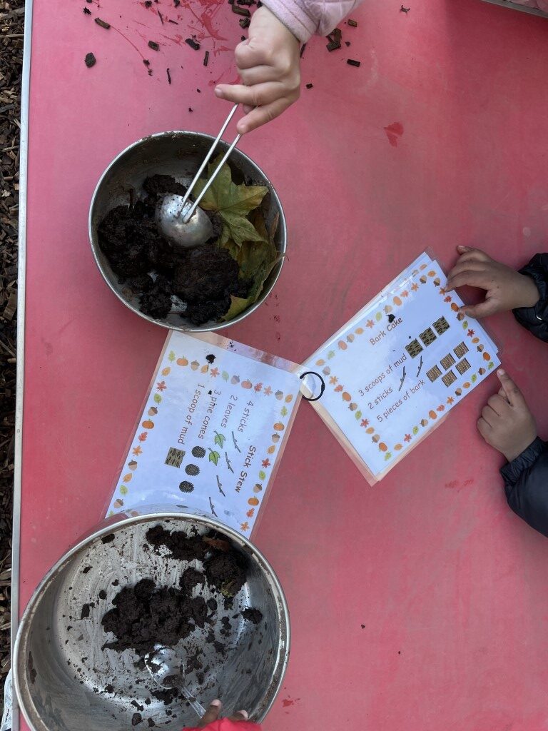 We have thought about numbers and measure in other areas too, exploring mathematical concepts through hands-on activities. The children have been investigating height and length, comparing sizes and developing understanding of measurement, and exploring quantities of ingredients to add to their creations in the mud kitchen whilst experimenting with concepts like “more,” “less,” and “enough” through imaginative cooking play.