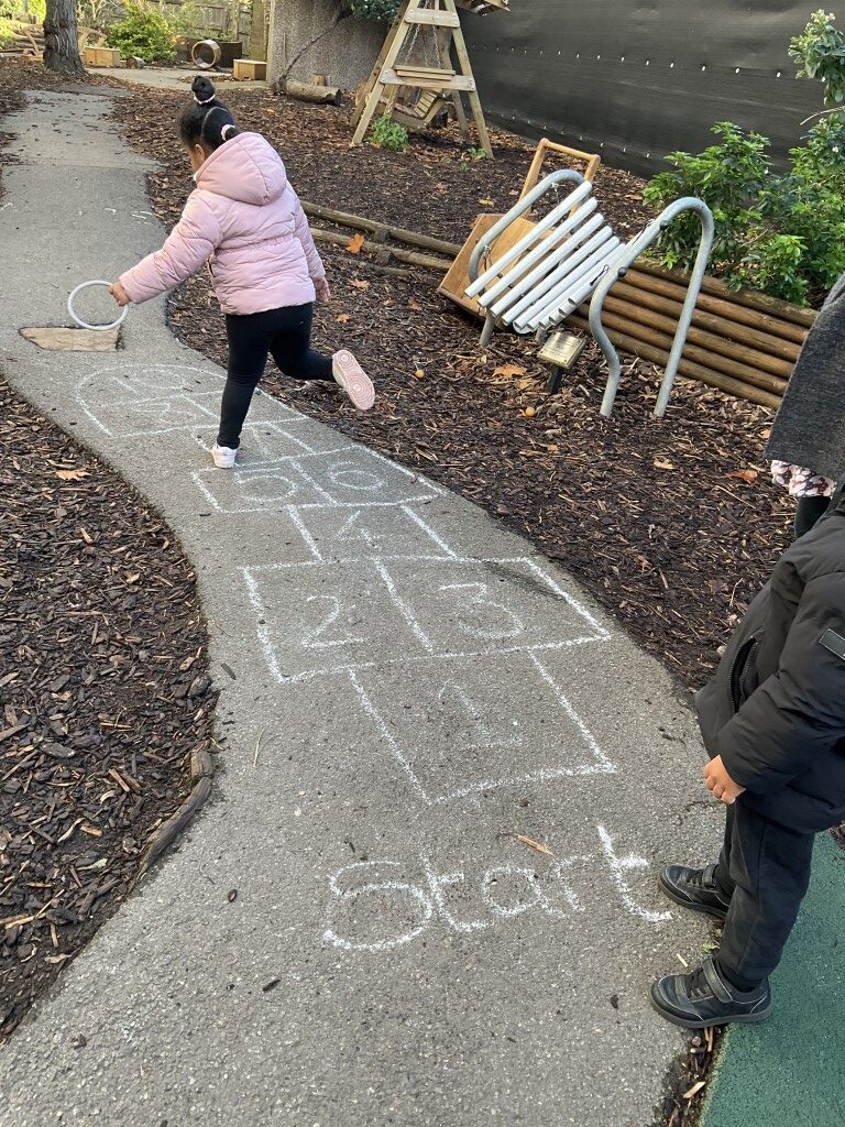 This week we have been keeping warm in the garden by dancing to music and moving our bodies playing hopscotch, developing gross motor skills and coordination whilst enjoying physical activity in the colder weather. Hopscotch also introduces early number recognition and sequencing as children navigate the numbered squares.