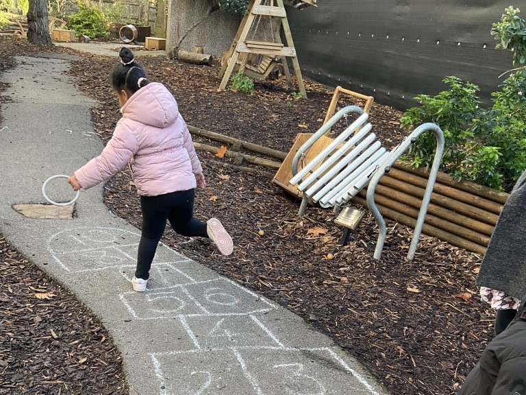 This week we have been keeping warm in the garden by dancing to music and moving our bodies playing hopscotch, developing gross motor skills and coordination whilst enjoying physical activity in the colder weather. Hopscotch also introduces early number recognition and sequencing as children navigate the numbered squares.