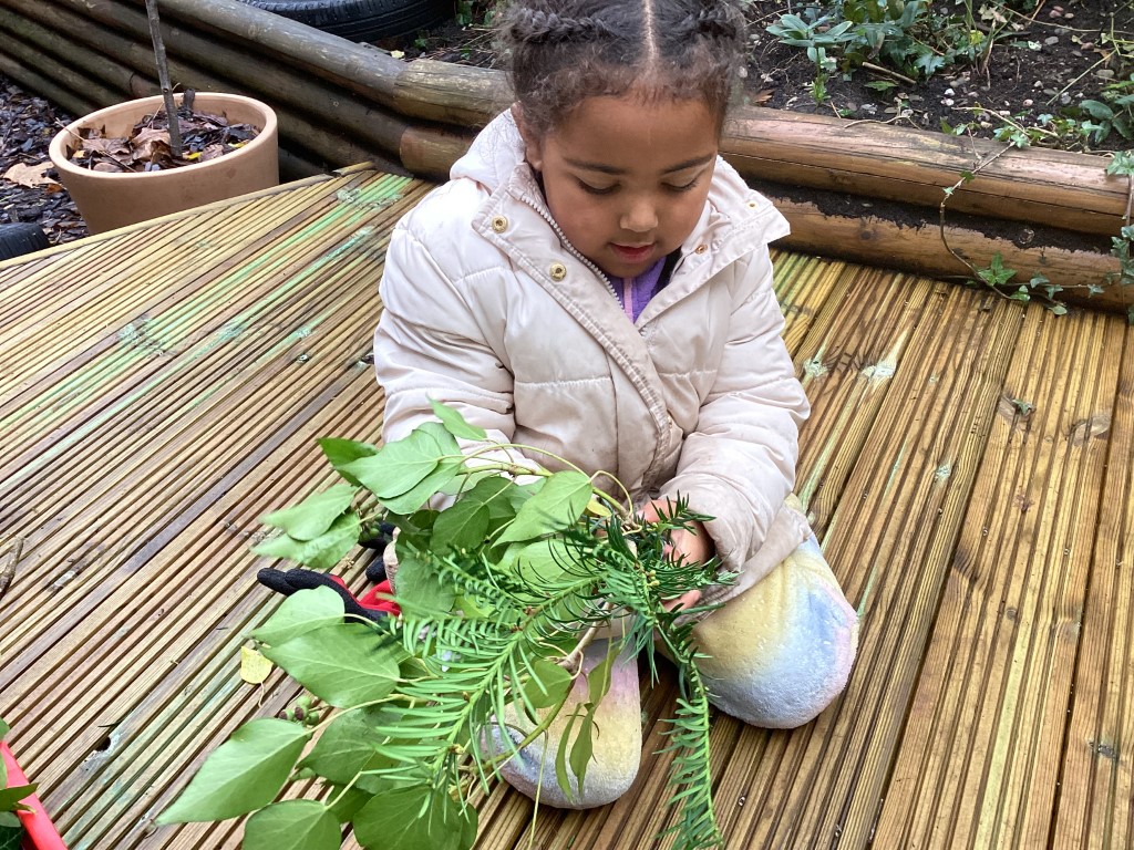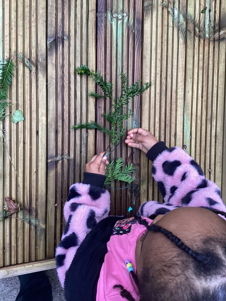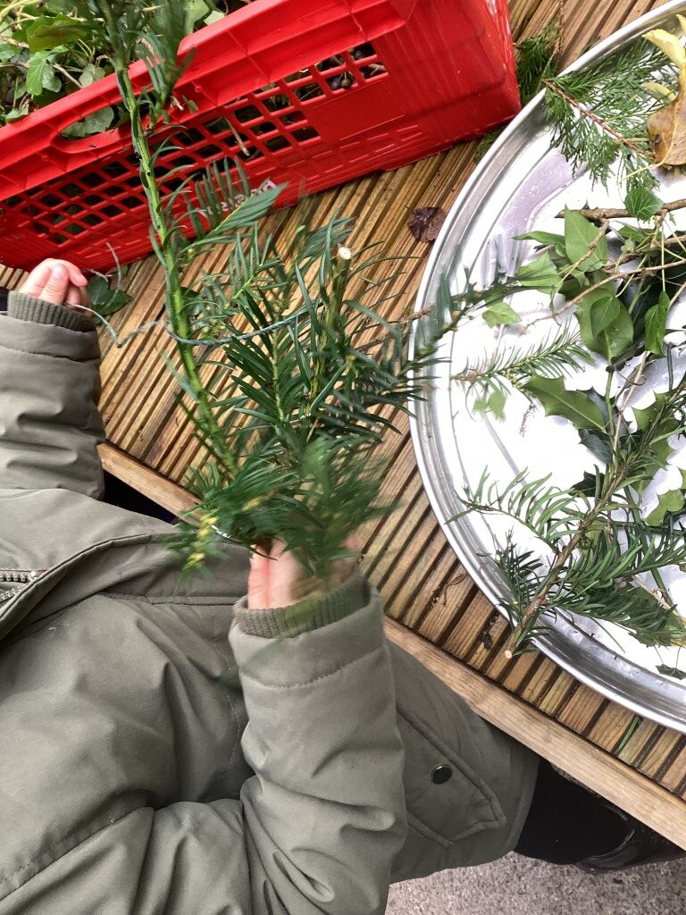 We have made Christmas sprays for the garden with holly, ivy, and fir, thinking about the evergreen trees that provided the leaves and why some trees stay green and others don’t. This seasonal activity connects children with nature whilst introducing scientific concepts about deciduous and evergreen plants, helping them understand the natural world around them.