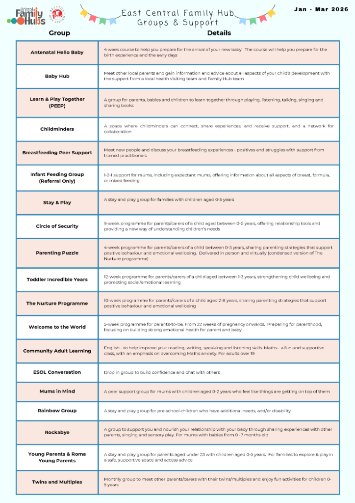 East Central Family Hub is offering a comprehensive programme of groups and support services for families across East and Central Bristol throughout the first quarter of 2026.
