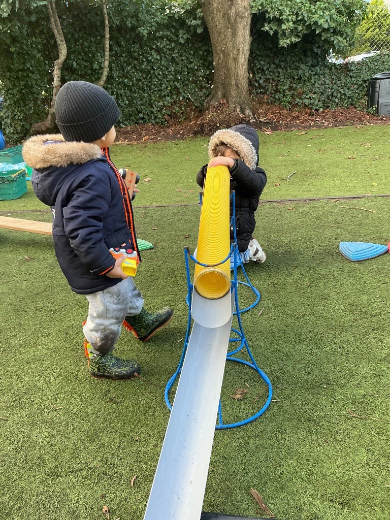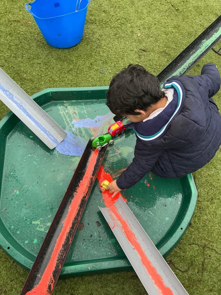 The children have enjoyed building ramps for the cars in the garden, so we extended this by adding watery powder paint to the guttering and creating exciting marks as they raced down and away. This combination of physics and art helped children explore movement, speed, and colour whilst developing their understanding of cause and effect through hands-on experimentation.