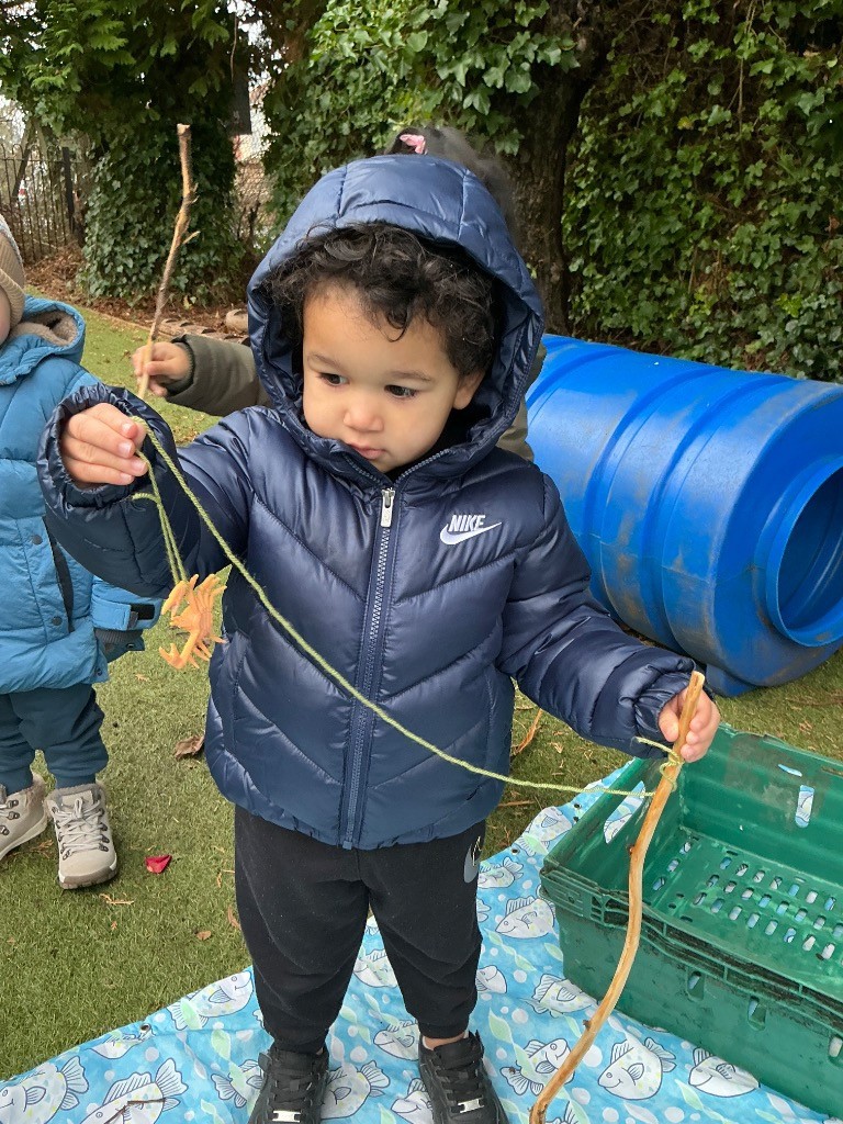 The children showed an interest in building boats in the garden, so we gathered sticks and made fishing rods with string, transforming their imaginative play into real constructions. This activity developed fine motor skills through knot-tying and threading whilst encouraging problem-solving and creative thinking.