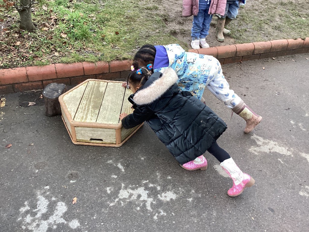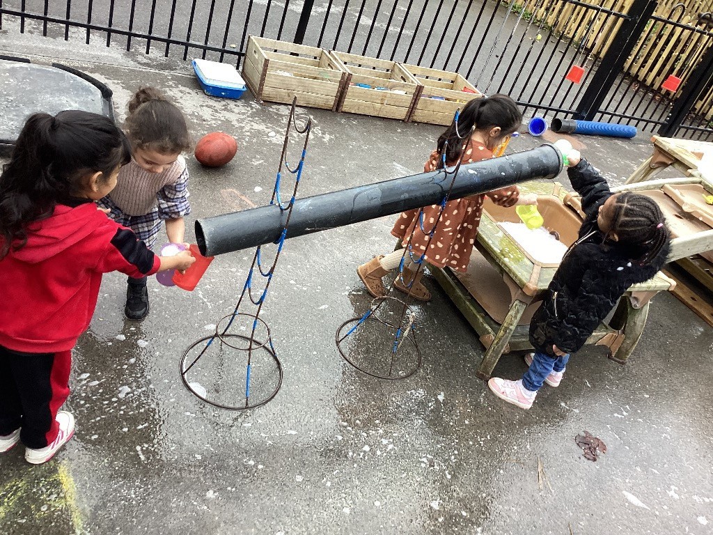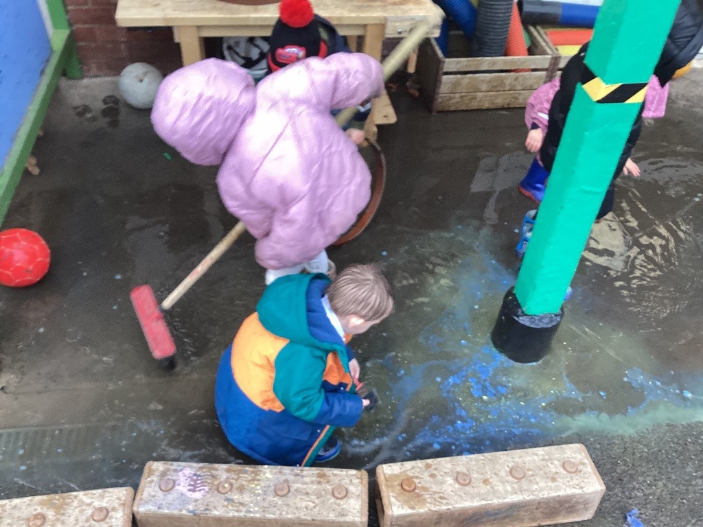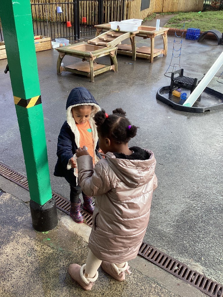 The children from both classes have been enjoying all weathers this week, experiencing the outdoors in rain and sunshine. They have been collecting the rain in pots, splashing and transporting the water from the puddles, working together as a team to create purposeful play and solve problems such as how to move water efficiently and where to pour it next.