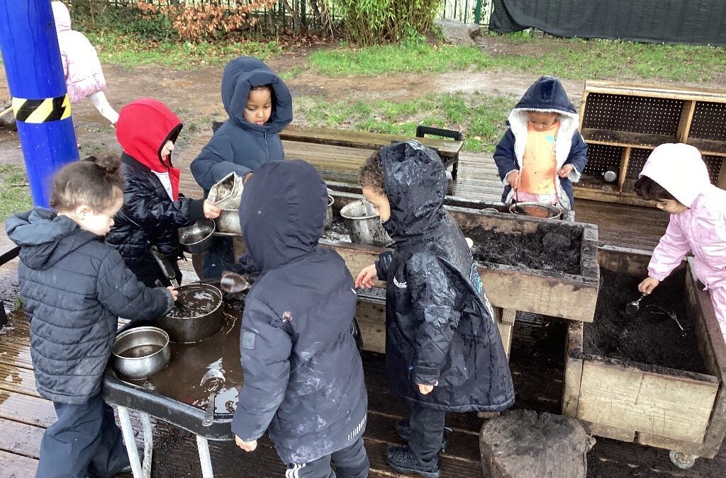 The children have been discussing what happens when we add water to the mud and what creations we could make, exploring the properties of materials and how they change when combined whilst developing their scientific thinking and creativity.