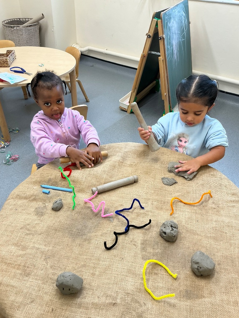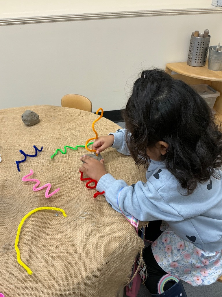 The children showed an interest in wrapping the clay, so we’ve introduced a variety of materials to explore this technique, including pipe cleaners, ribbons, and wool. The children have poked, suspended, wrapped, and threaded the clay, discovering new ways to transform and decorate this versatile material whilst developing fine motor skills through intricate manipulation.