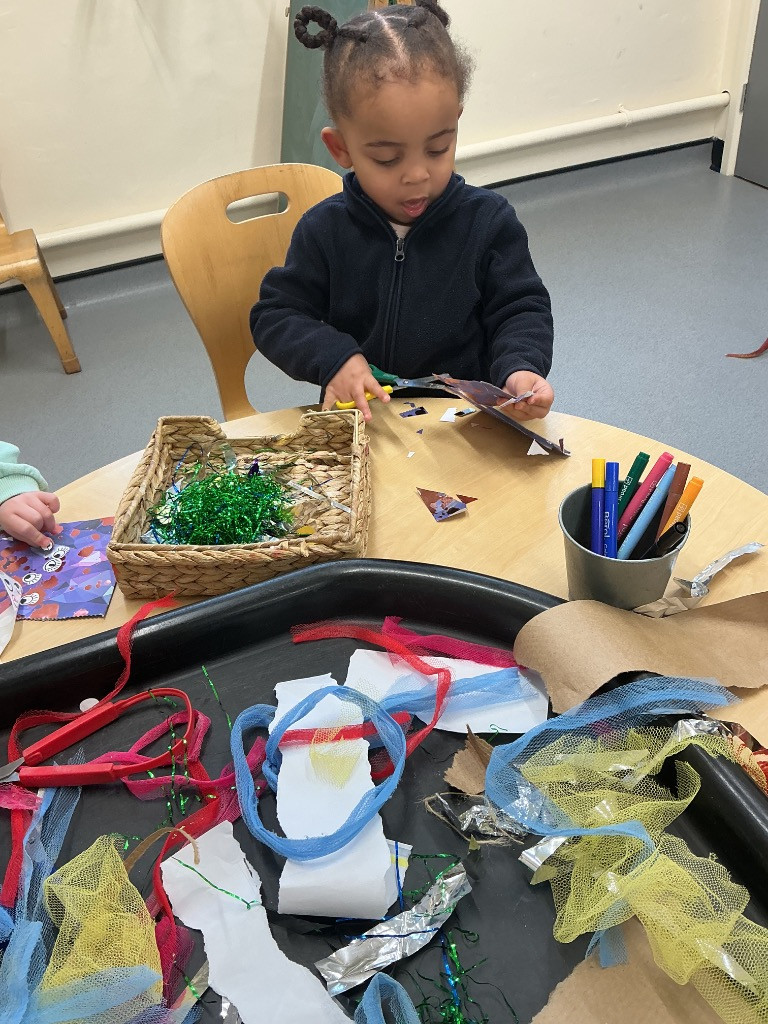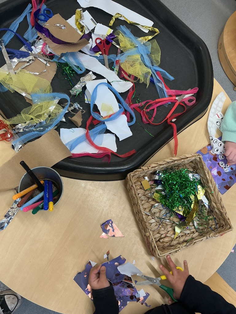 The children have shown an interest in developing their cutting skills, so we provided a tray with a variety of materials for them to practise after modelling how to use different scissors. This focused activity helps children build the hand strength and coordination needed for scissor control whilst gaining confidence in this important fine motor skill.