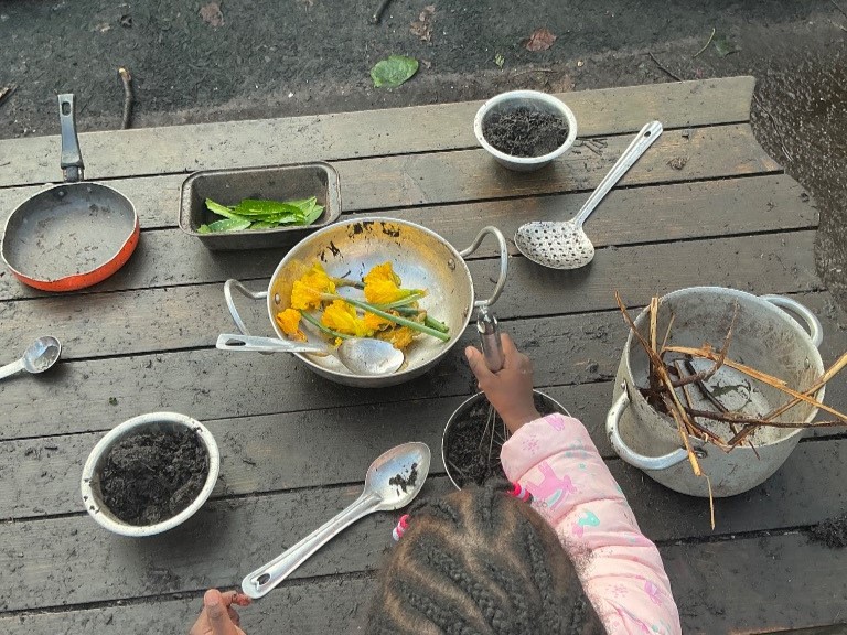 We’ve been enjoying exploring the first daffodils by introducing them in different places, including the mud kitchen, celebrating the arrival of spring and bringing seasonal flowers into our play. These natural materials inspire creativity and help children connect with the changing seasons whilst adding beauty to their imaginative cooking.