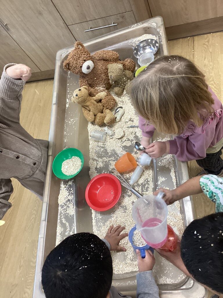 We also had fun making porridge during our cooking session and added some oats to our messy play for more fun! The children were feeding the bears their porridge because Goldilocks had eaten it all up, extending the story into imaginative role play whilst developing nurturing behaviours and sequencing skills.