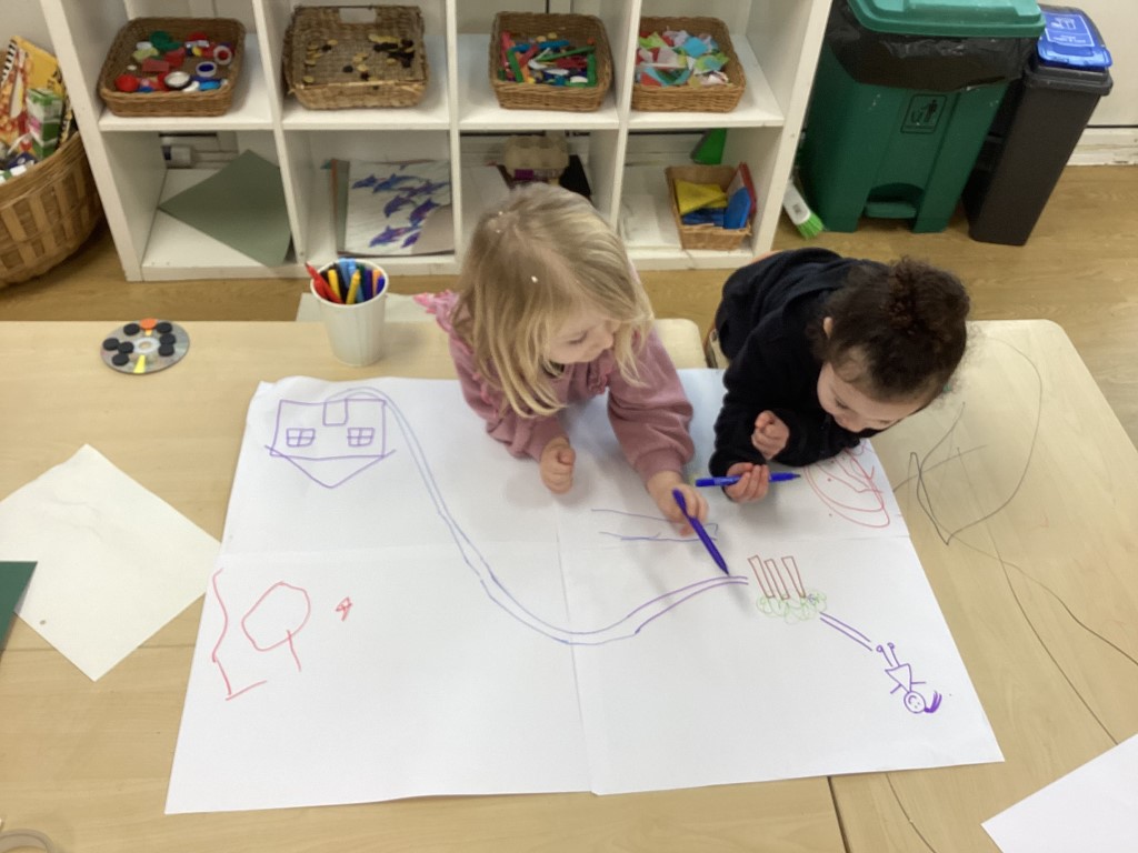 We were also creating a map for Goldilocks to find the bear’s cottage, collaborating together whilst developing spatial awareness, problem-solving, and early map-making skills as children represented a journey on paper.