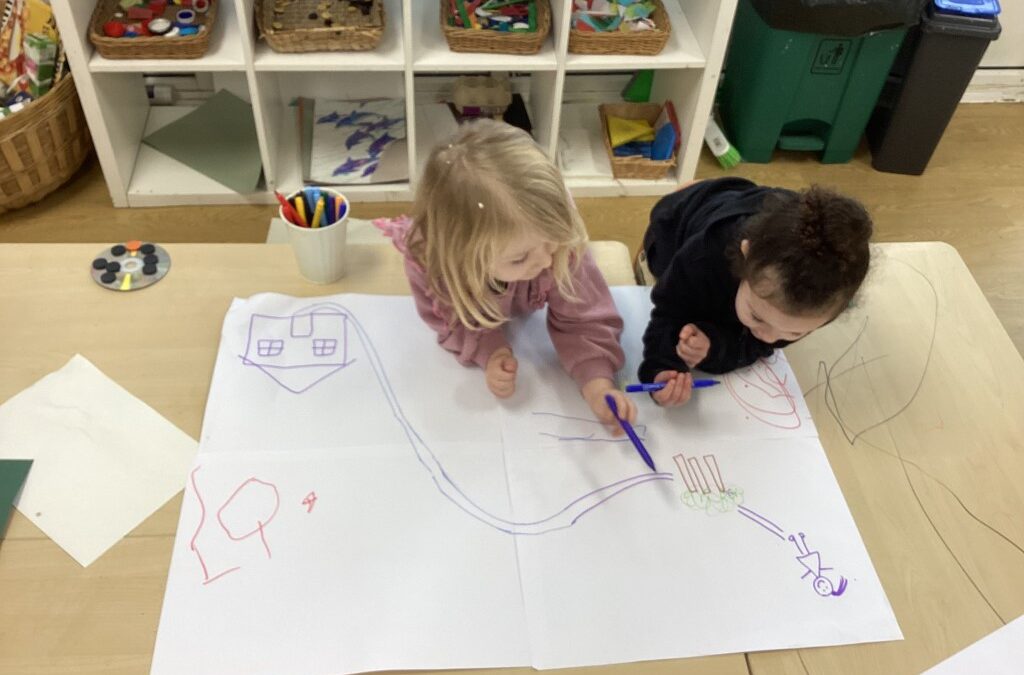 We were also creating a map for Goldilocks to find the bear’s cottage, collaborating together whilst developing spatial awareness, problem-solving, and early map-making skills as children represented a journey on paper.