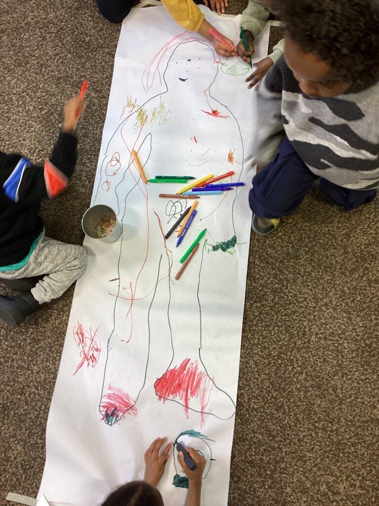 We have also been exploring our bodies this week, learning the names of different body parts and drawing around each other to create life-sized outlines. It was great fun and a brilliant way to develop children’s awareness of themselves and their own bodies.