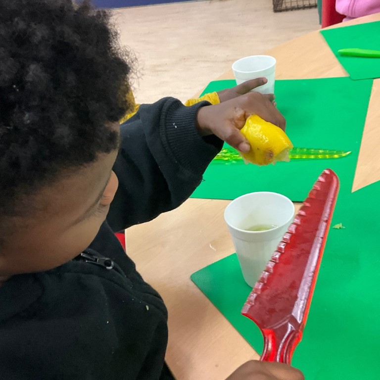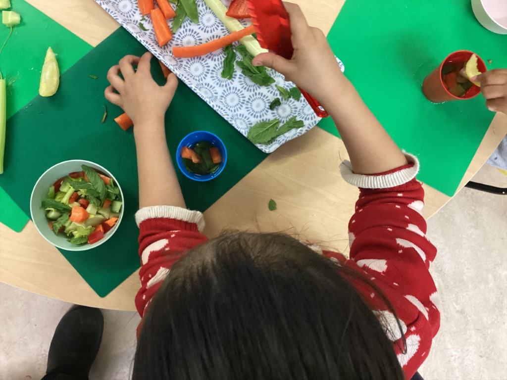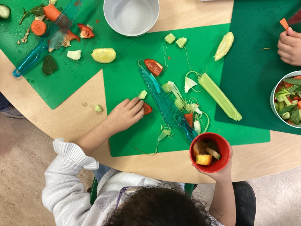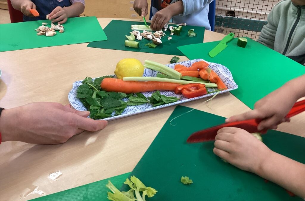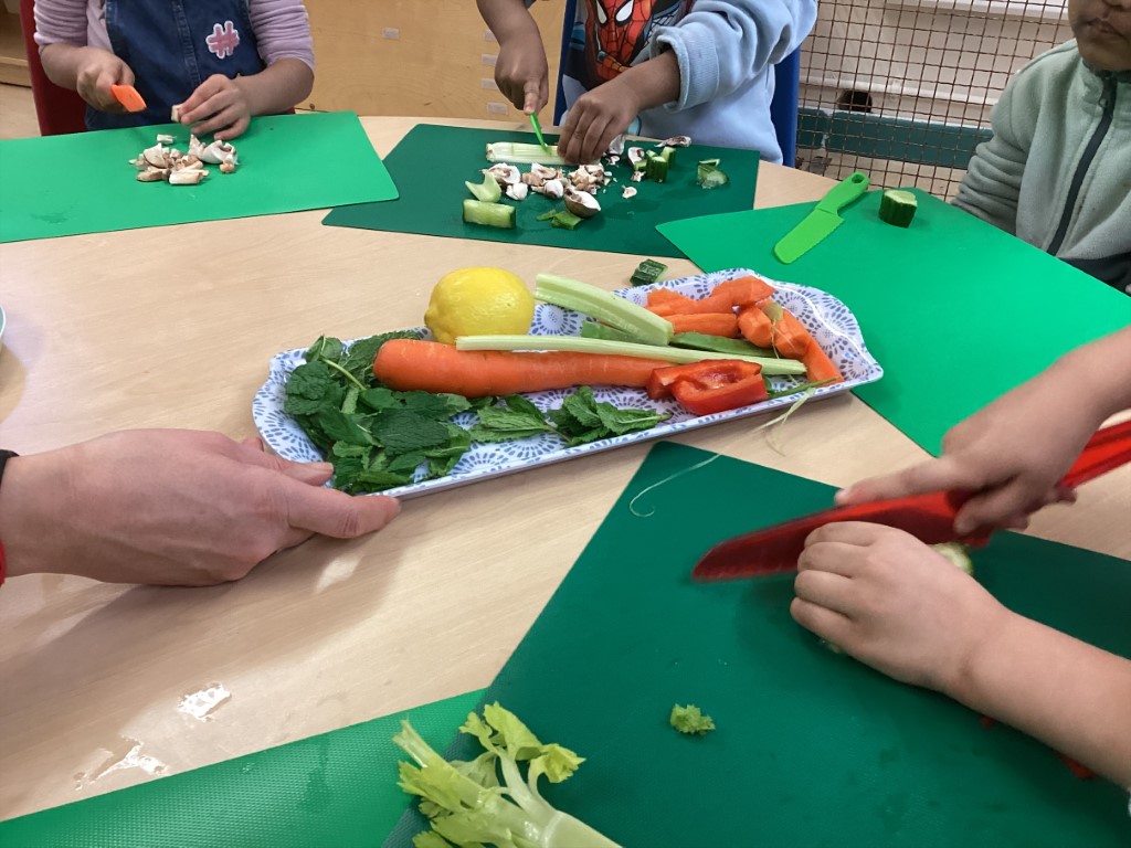The Children’s Kitchen team, Kelly, Jo and Claudia, have been coming in to support the children in exploring fresh fruit and vegetables, sniffing, handling and chopping their way through a brilliant range of produce whilst talking about where food actually comes from. These conversations are so valuable, helping children develop a real connection with the food they eat from a really early age.