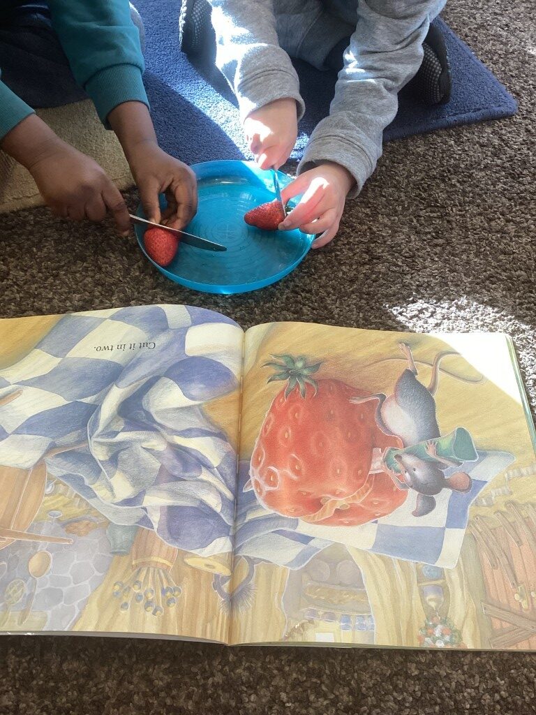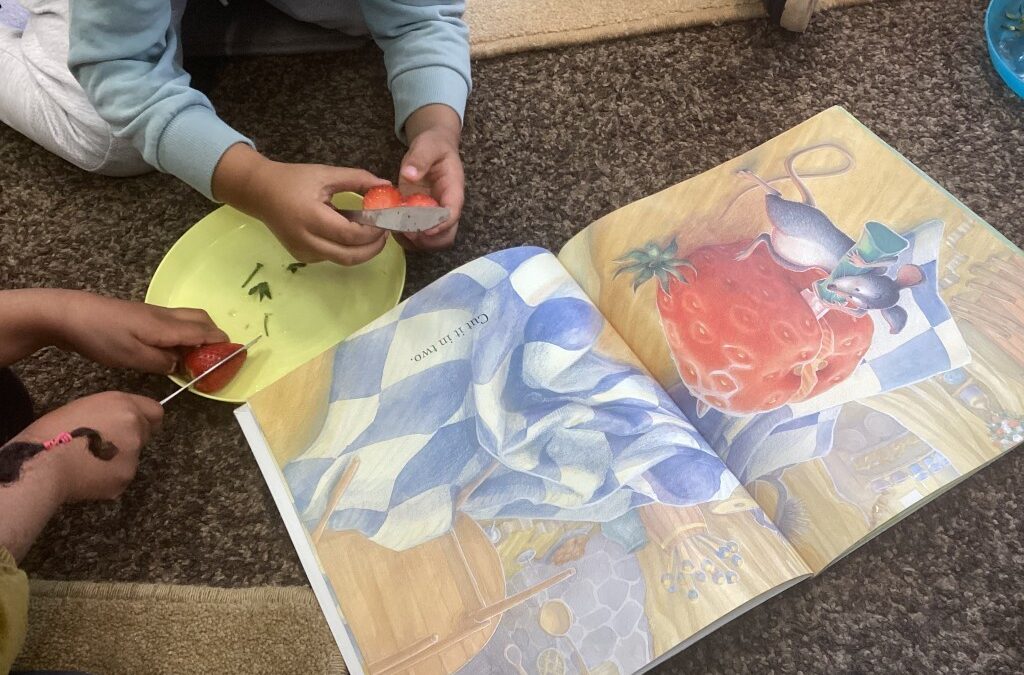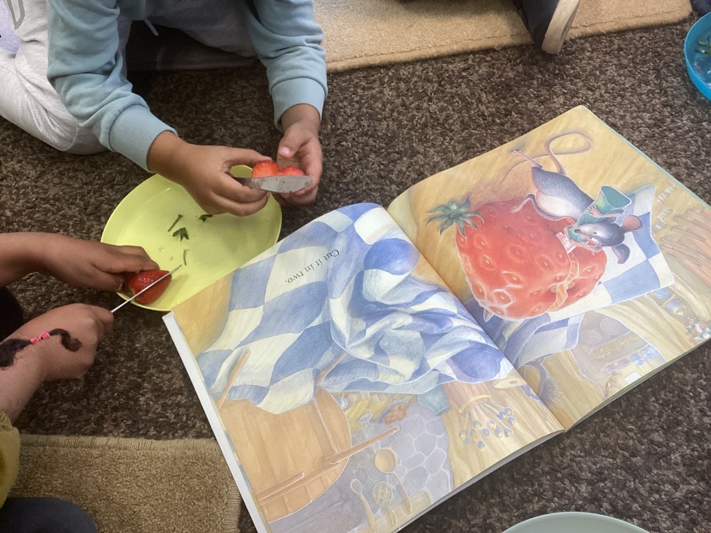 Our core book, The Big Hungry Bear, has been at the heart of learning. Inspired by the story, children have been chopping strawberries in half and sharing them with their friends, just like the mouse shares food in the book. These activities have supported children’s understanding of the story, encouraged turn-taking and sharing, and helped build important independence skills through safe food preparation.